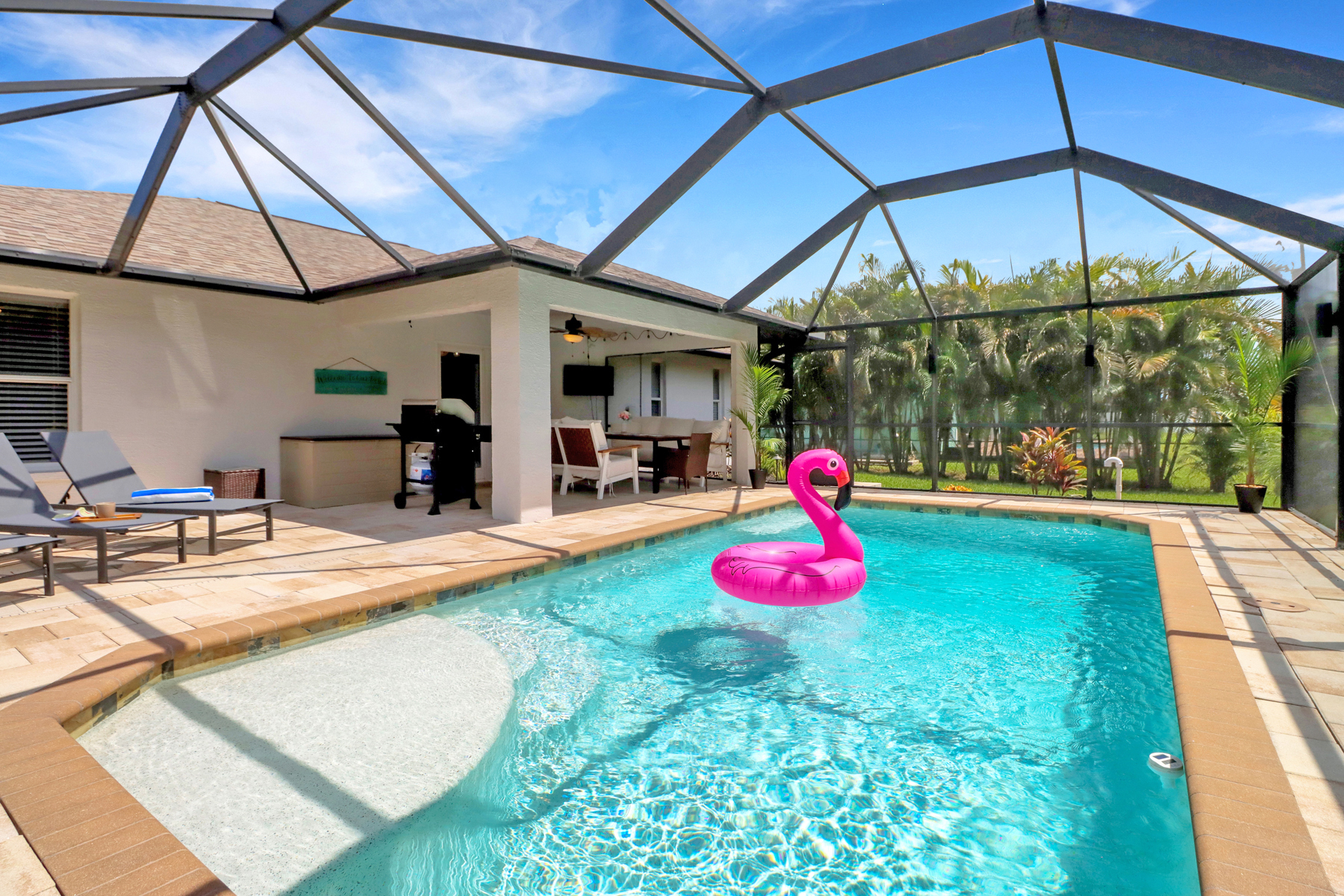 Newly furnished heated pool home in sought-after, established neighborhood minutes to shopping, dining, and Gulf-access boat ramps. Relax and unwind, and enjoy Cape Coral vacationing at its finest! Your family will be close to everything when you stay at this centrally-located place. The cozy patio area invites for relaxing times by the pool with TV and BBQ grill. You will find fishing rods and beach equipment in the garage. Oversized garden area for privacy. A portable pool fence can be installed for more safety for small children.