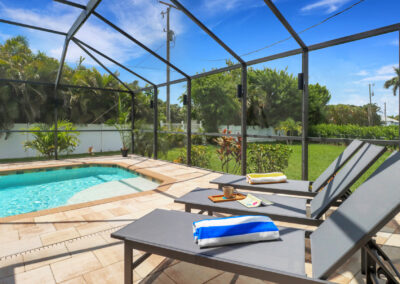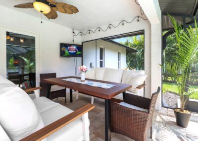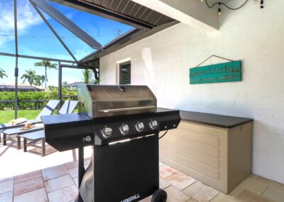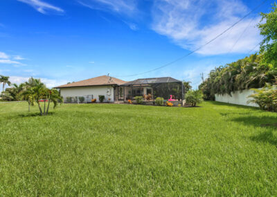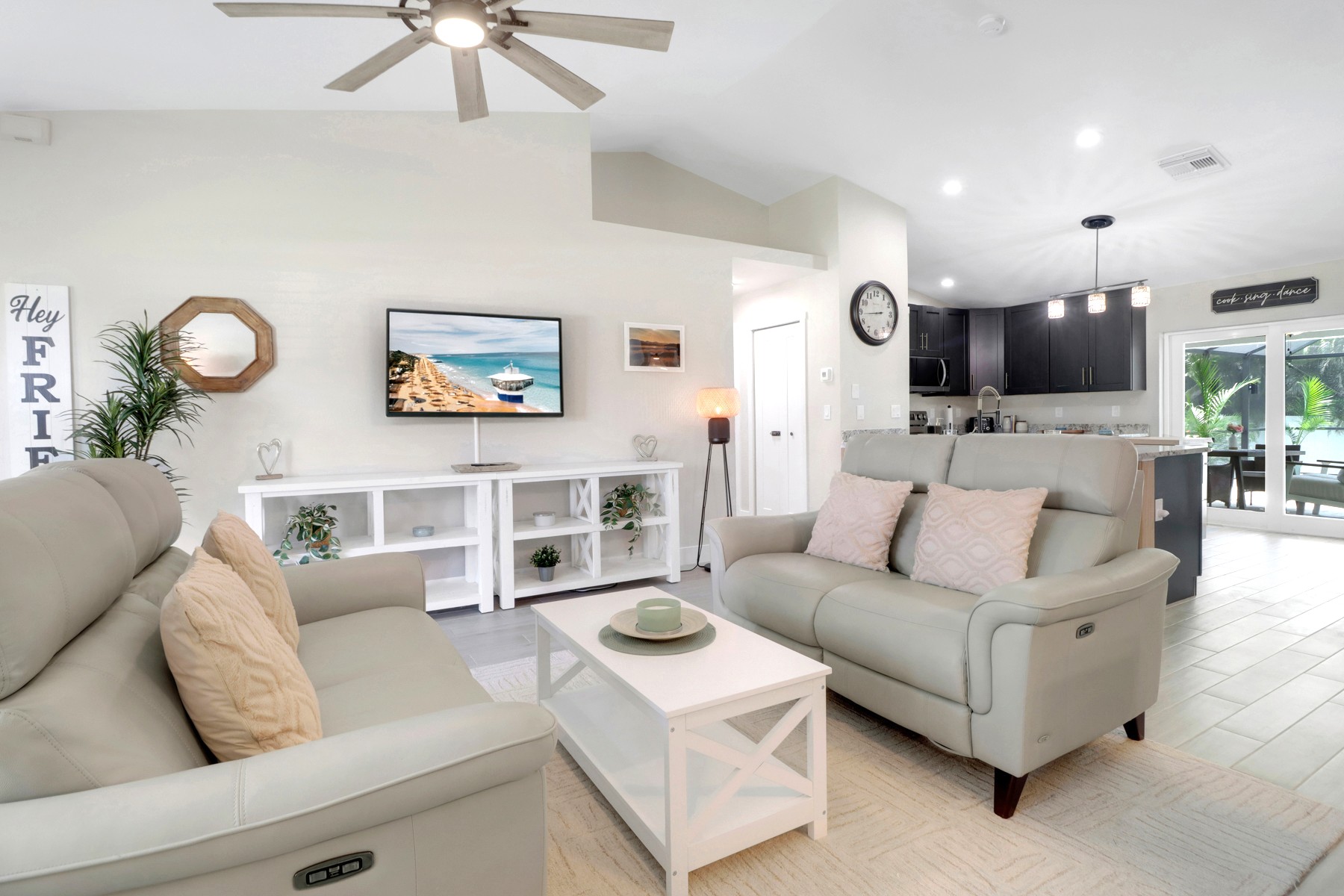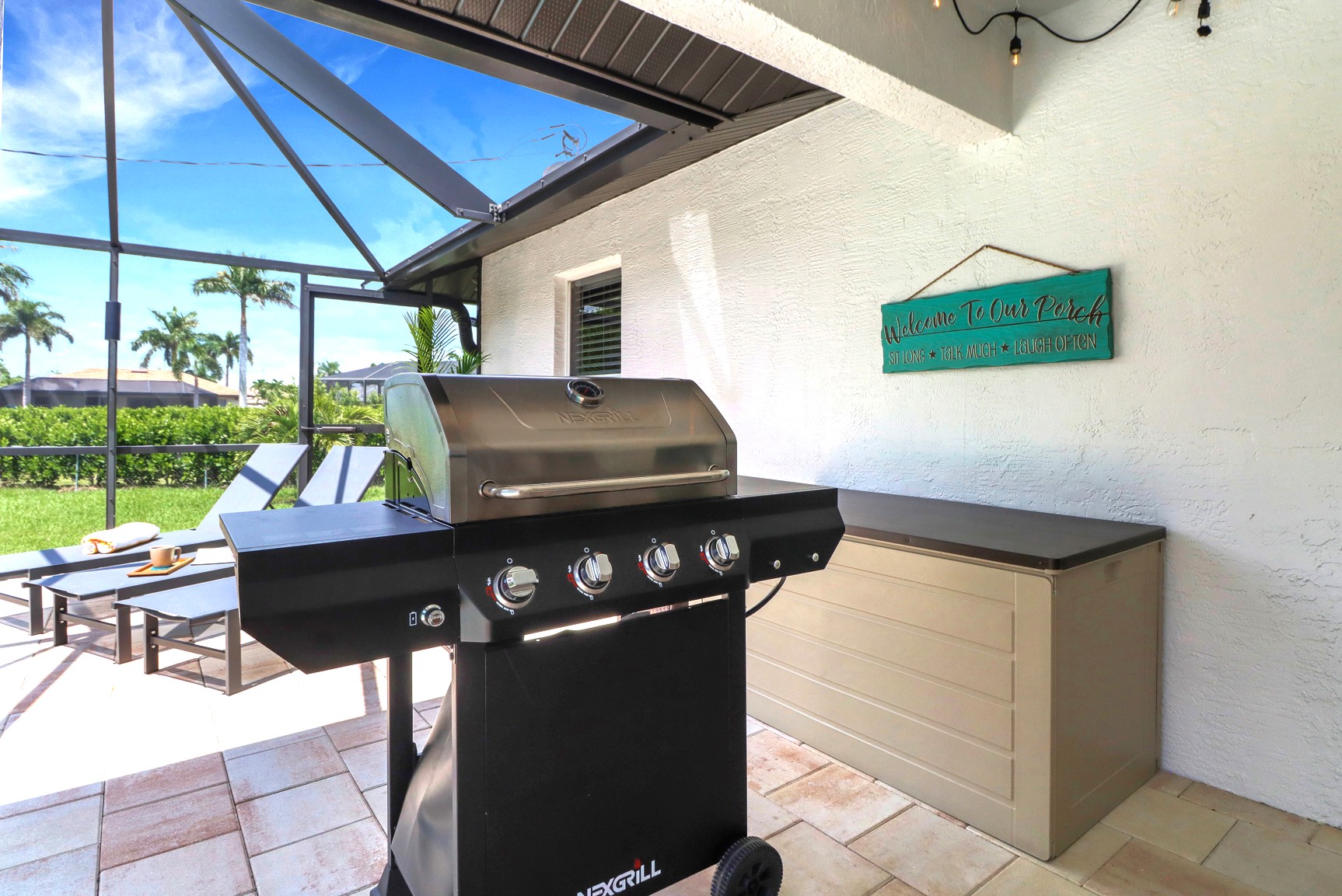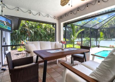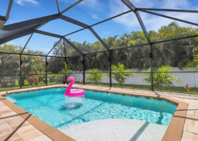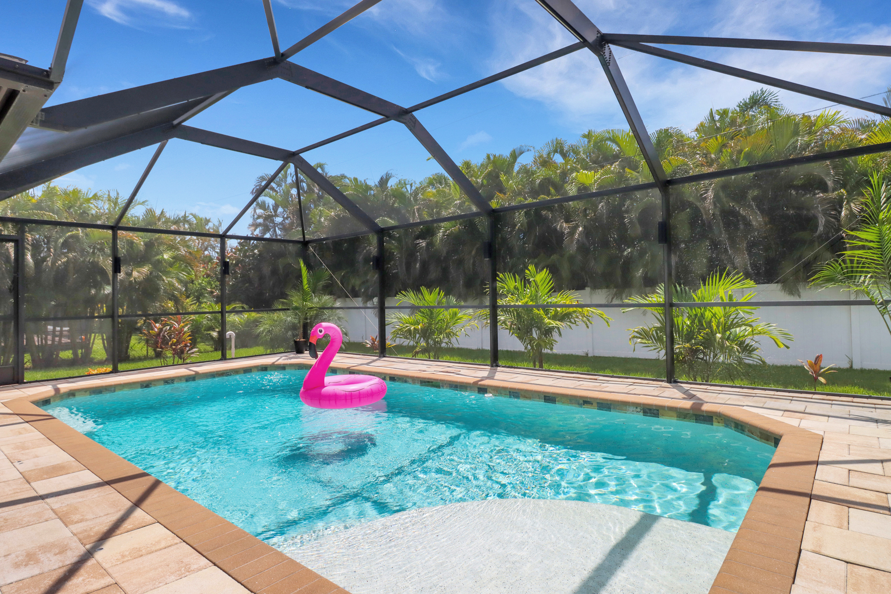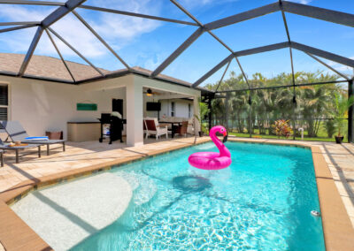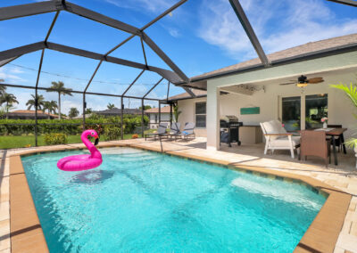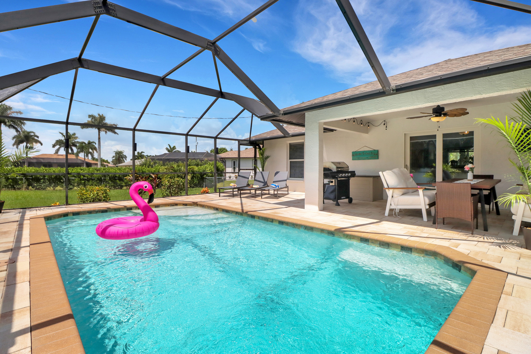 Newly furnished heated pool home in sought-after, established neighborhood minutes to shopping, dining, and Gulf-access boat ramps. Relax and unwind, and enjoy Cape Coral vacationing at its finest! Your family will be close to everything when you stay at this centrally-located place. The cozy patio area invites for relaxing times by the pool with TV and BBQ grill. You will find fishing rods and beach equipment in the garage. Oversized garden area for privacy. A portable pool fence can be installed for more safety for small children.