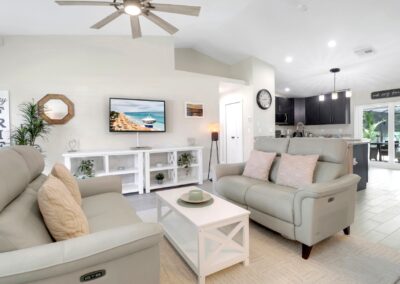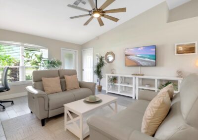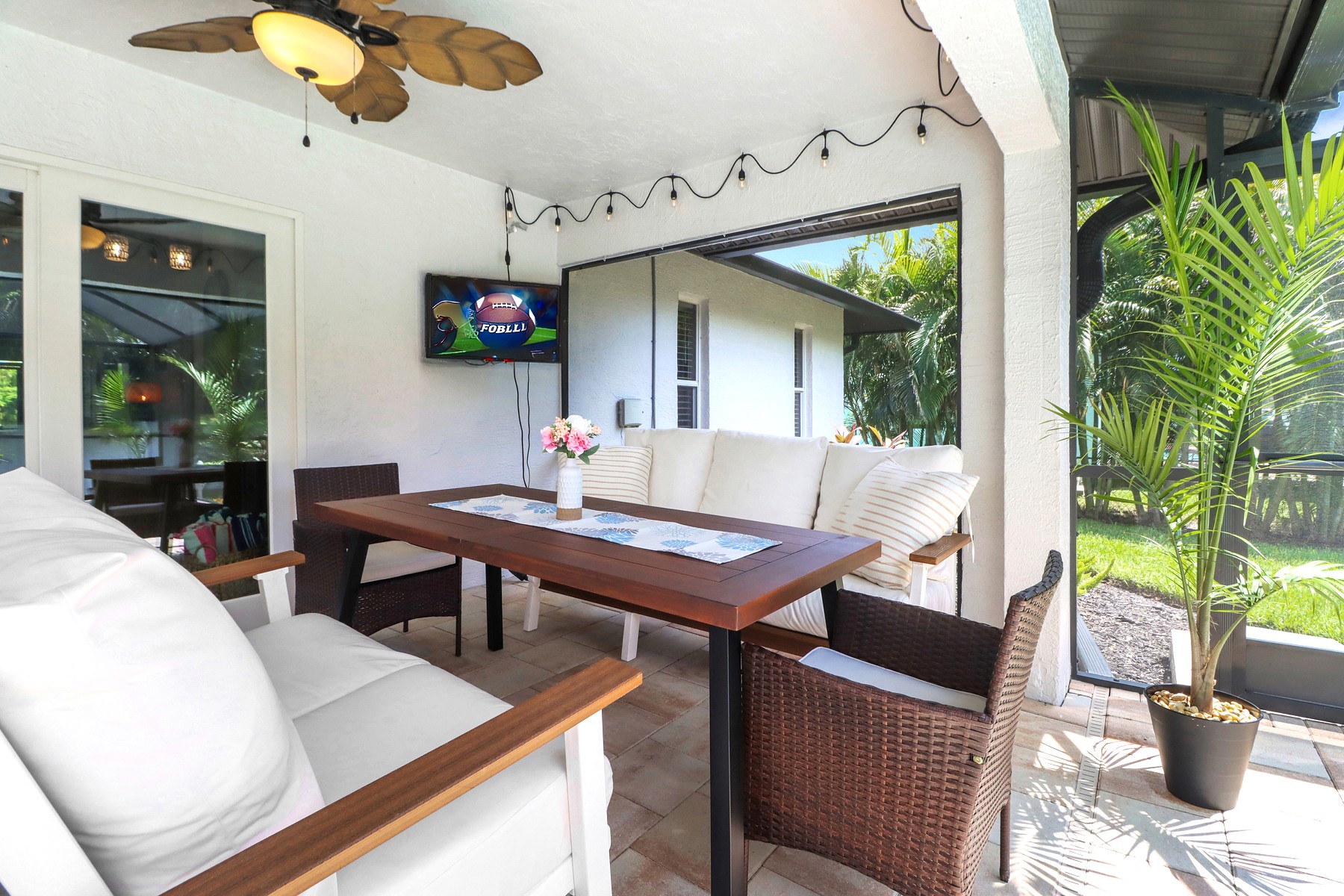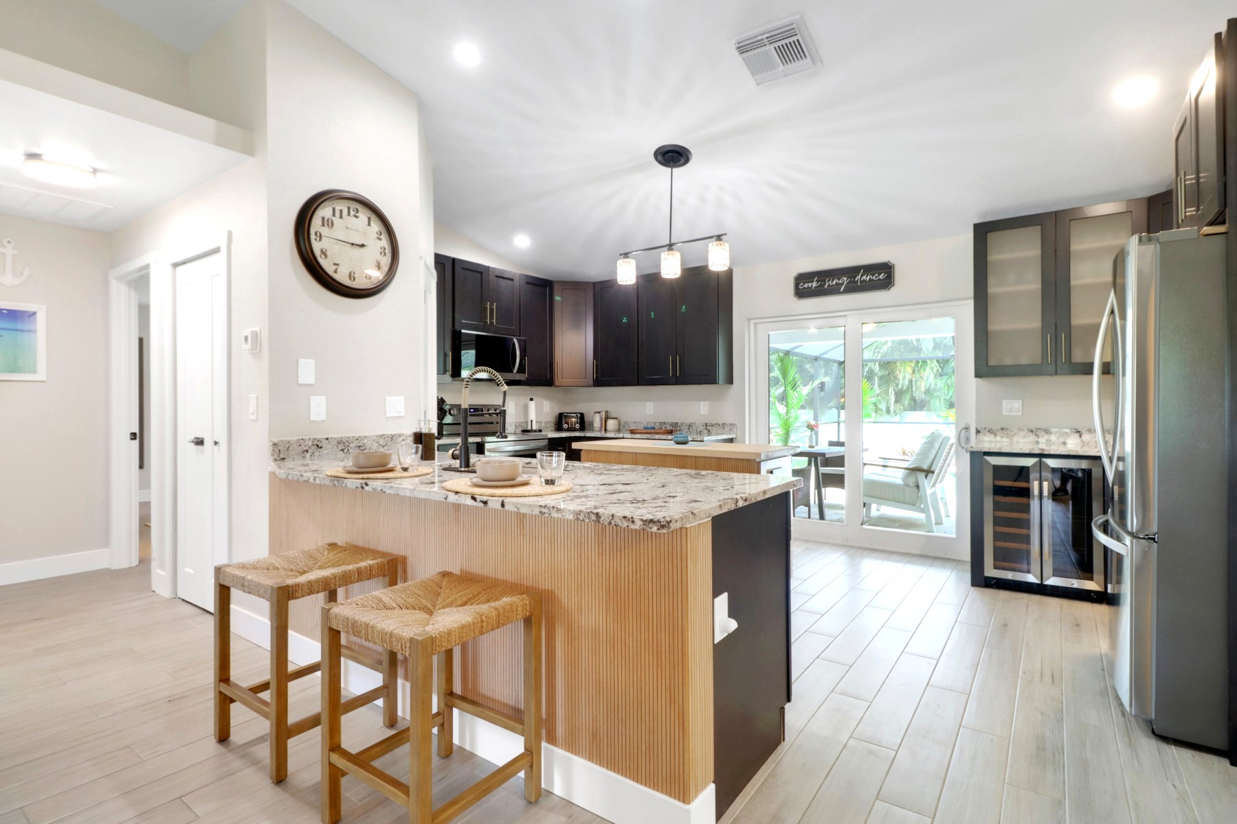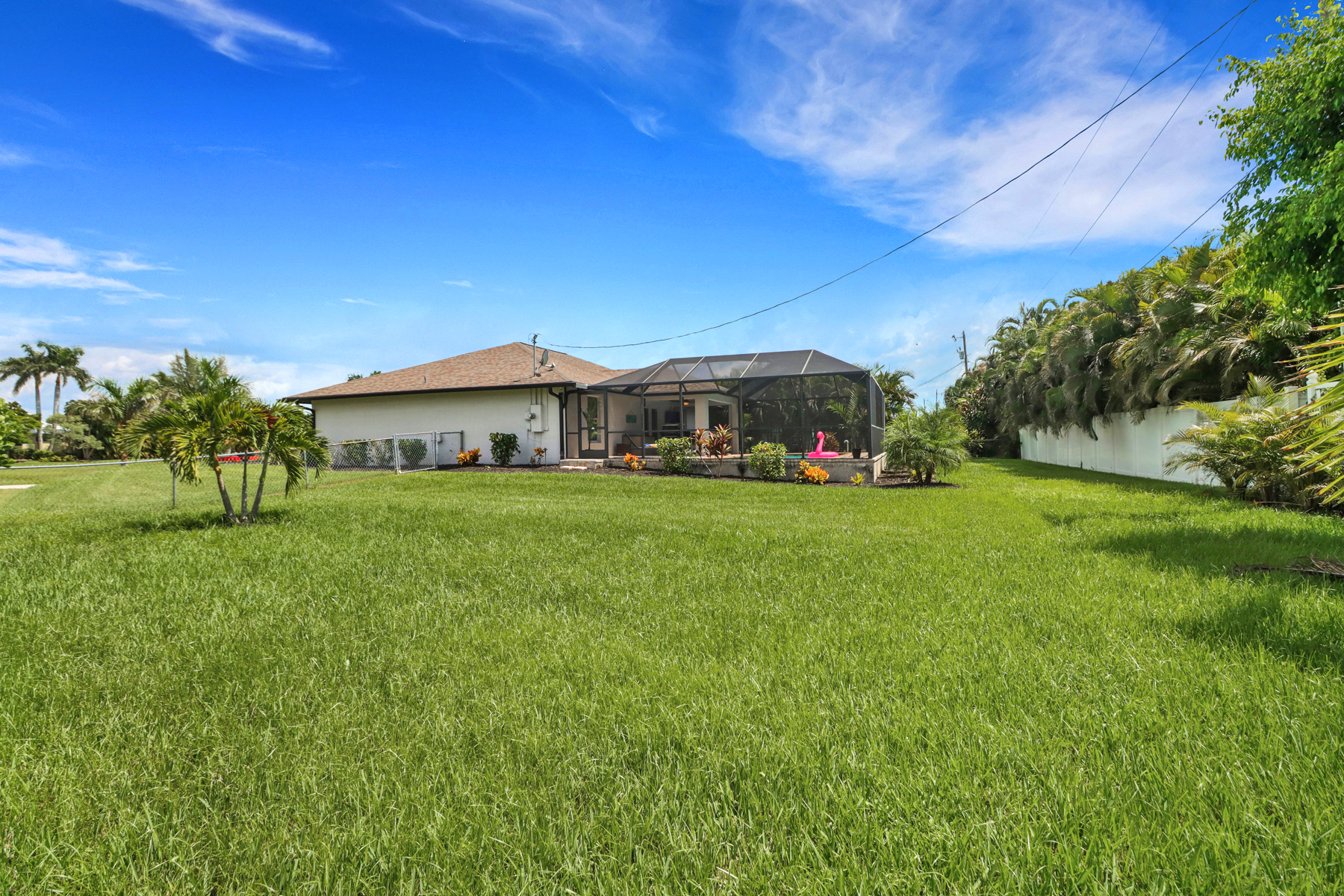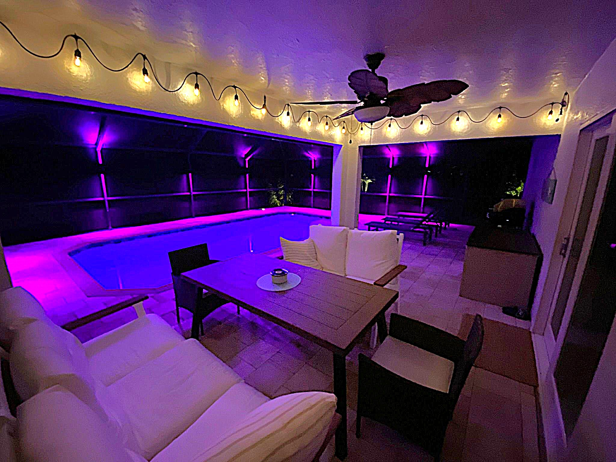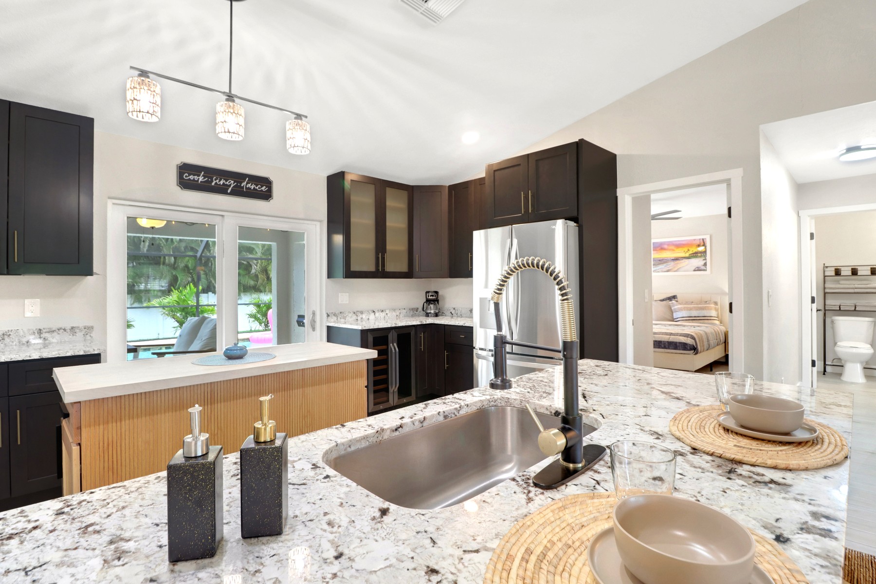 Newly furnished heated pool home in sought-after, established neighborhood minutes to shopping, dining, and Gulf-access boat ramps. Relax and unwind, and enjoy Cape Coral vacationing at its finest! Your family will be close to everything when you stay at this centrally-located place. The cozy patio area invites for relaxing times by the pool with TV and BBQ grill. You will find fishing rods and beach equipment in the garage. Oversized garden area for privacy. A portable pool fence can be installed for more safety for small children.